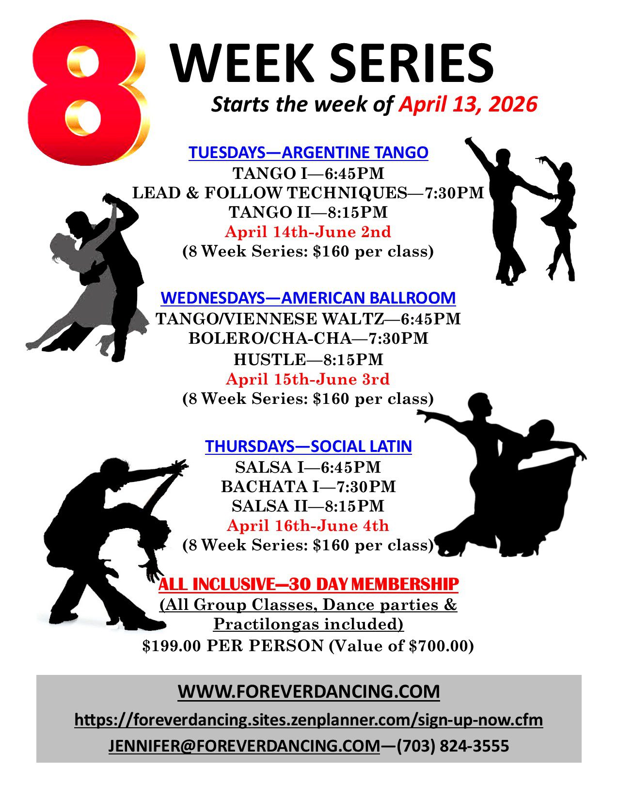 In addition to Ballroom and Latin dance lessons, we offer Argentine Tango, Salsa, Bachata, Wedding Dance, Swing, and more classes throughout Falls Church, Arlington, and Alexandria.